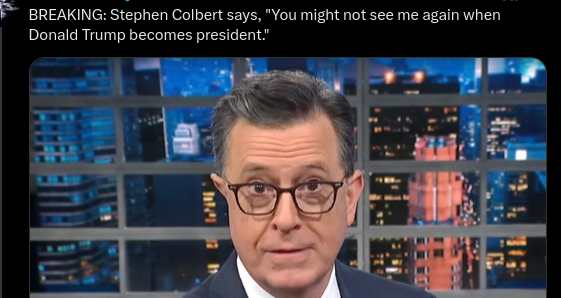 Stephen Colbert says, “You might not see me again when Donald Trump becomes president.”